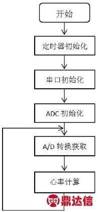 在主程序中,首先进行定时器初始化、串口初始化以及ADC初始化,用于心跳周期测量、串口数据发送以及A/D转换。之后循环执行A/D转换,心率计算程序。其流程如图2所示。在进入串口中断服务子程序后,关闭串口中断,避免发送数据产生重复中断。依次发送AD值与心率值,发送完成后再次打开串口中断返回。定时器每1ms中断一次,中断服务函数中以计数变量计时,计数变量在心率测量函数中进行清零。