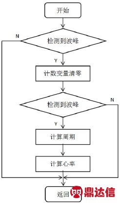心率计算使用测周法,即测量心跳波形周期,进而推算心率。心跳波形中每个周期会出现一高一低两个波峰,需进行过滤处理。具体方法是在上位机设定检测阈值,只有幅值大于阈值的波峰可被检测。下位机测量时,根据阈值自动滤掉较低的波峰,以较高的波峰为准测量周期。使用定时器定时并利用计数变量计算周期,第一次检测到波峰时开始计时,第二次检测到波峰时停止计时,便可得到心跳周期。心率计算公式:BPM= 60/T,其中BPM为心率值,T为心跳周期。心率计算程序流程图如图3所示。