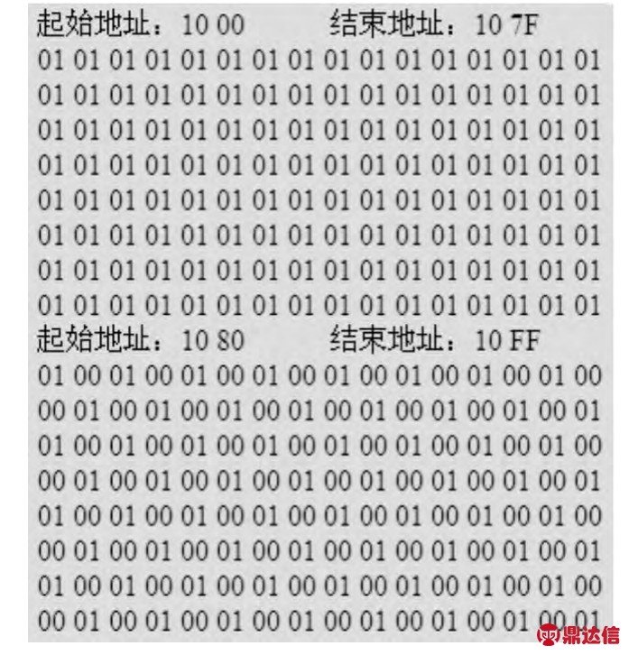 通过制定测试方案,对国内某反熔丝PROM器件进行了编程测试,验证其基本功能,达到了设计预期指标。以下是对国内某反熔丝PROM器件的测试:1)编程前读测试:编程前,对器件进行读校验,读出数据全为“0”,确保该器件未被编程。2)编程测试:对器件所有反熔丝存储单元写“1”操作,判定编程器可以对所有反熔丝单元编程。如图8所示为对地址单元1000~107F写“1”后读出数据。3)间隔编程测试:对器件间隔编程,验证编程器不会将相邻地址单元误编程。如图8所示为对地址单元1080~10FF间隔编程后读出的结果。