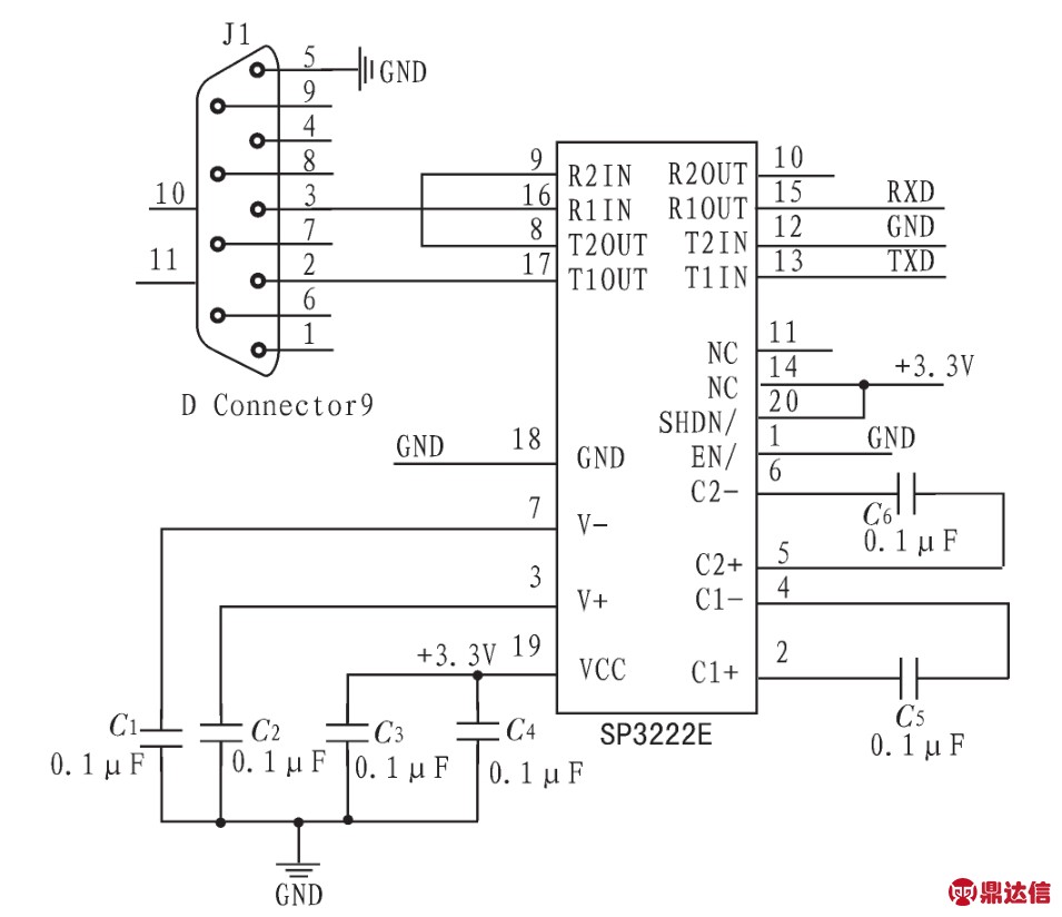 近距离通信时,通过三根线(TXD、RXD、GND)就可以实现计算机与编程器的全双工异步串口通信。在TXD和RXD上:逻辑“1”为-3 V 至-15 V,逻辑“0”为+3 V 至+15 V[4]。 由于本系统为+3.3 V系统,编程器是TTL或CMOS逻辑电平,因此采用电平转换芯片SP3222EEA,该芯片能实现TTL或CMOS逻辑电平与RS-232电平之间的转换。如图4所示为RS232串口通信电路图。
