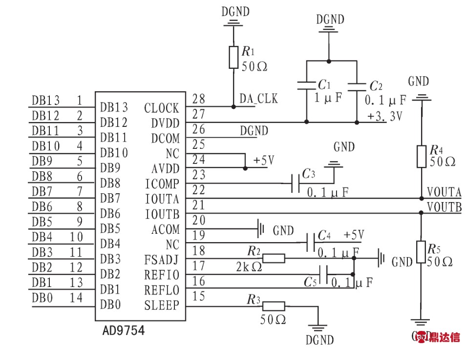 数模转换器能将二进制数值转换为直流电压,该电压信号经放大后为反熔丝器件提供编程电压。在测试阶段可不断改变编程环境调整编程电压,找到最佳编程电压,获得最佳编程效果。数模转换器采用美国ADI公司生产的一款高速电流型输出TxDAC系列14位数模转换器AD9754。AD9754具有125MSPS转换速率,带一个片内1.2 V参考电压V REFIO,数字端口兼容CMOS电平。如图5所示为模数转换电路图。