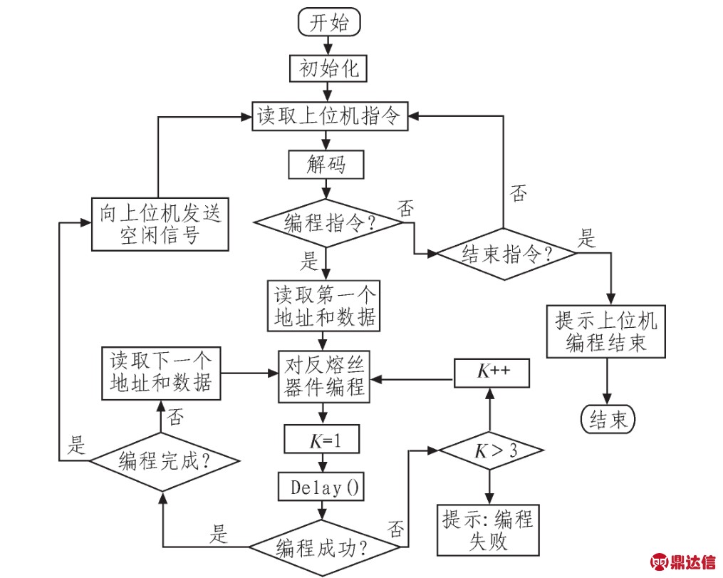 编程数据采用Hex文件格式,计算机通过加载Hex文件将编程数据自动发送给编程器,编程器根据接收到的数据对反熔丝器件编程,实现反熔丝器件的自动高效编程。程序流程图如图9所示。编程器每次只接收一行Hex文件数据,只有当该行数据全部编程结束才向上位机发送空闲指令,通知上位机发送下一行数据,直到整个Hex文件的数据都烧录到反熔丝器件中。程序中加入硬件判错机制,如果对某一单元编程不成功,那么再进行额外两次编程,三次编程均失败则判定出现了异常,强行跳转,并提示用户检查相关故障。
