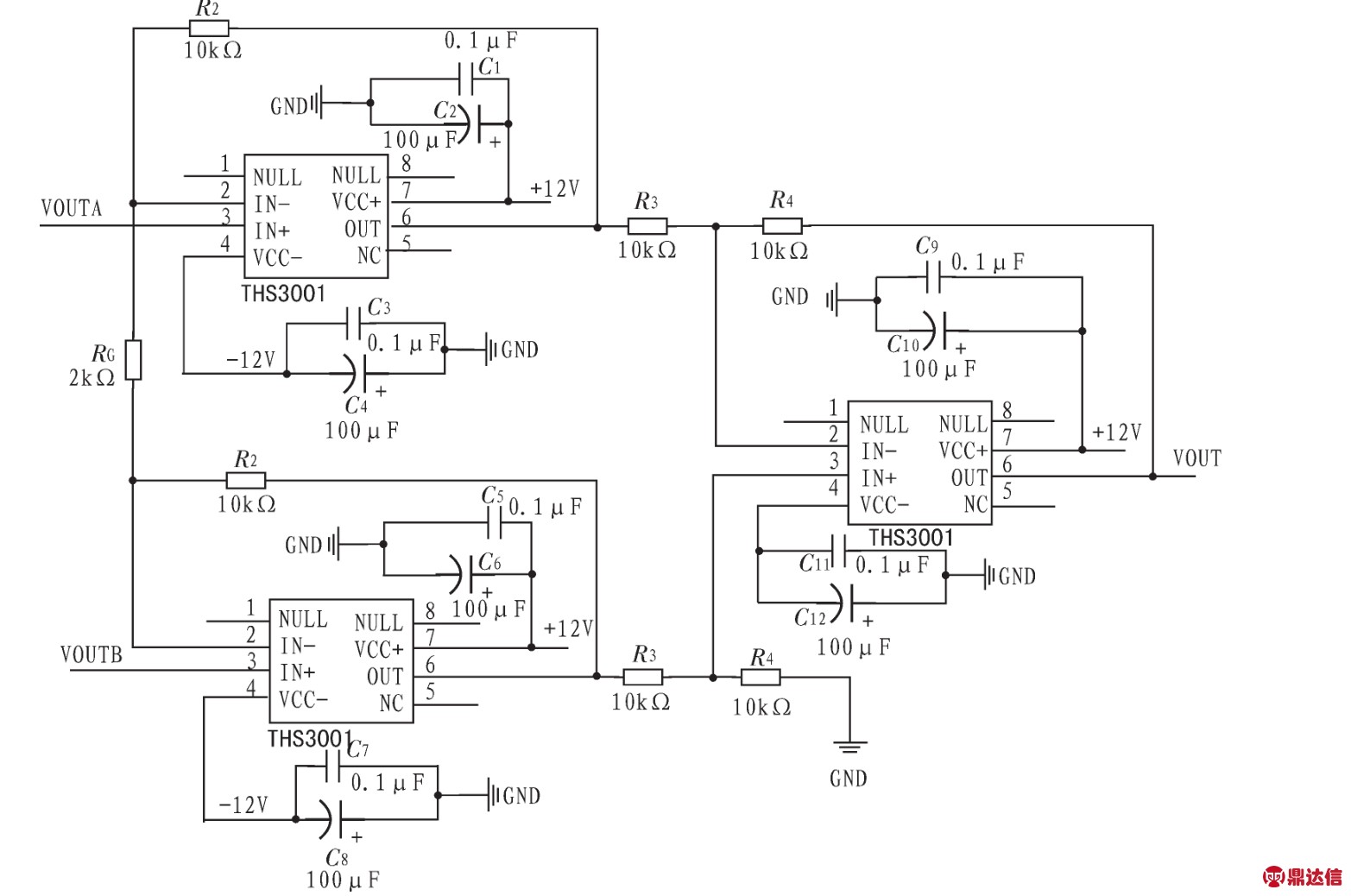 数模转换电路产生的信号源较微弱,不足以直接向反熔丝器件提供编程电压,需要对初始模拟信号进行放大。AD9754输出差分信号,且输出阻抗大于100 kΩ,所以采用经典的三运放构成的仪用放大电路[6]。运放选用TI公司的高速电流反馈型放大器THS3001,该放大器具有420 MHz带宽,6 500 V/μs,适用于高速DAC缓冲。如图6所示为信号放大电路图。