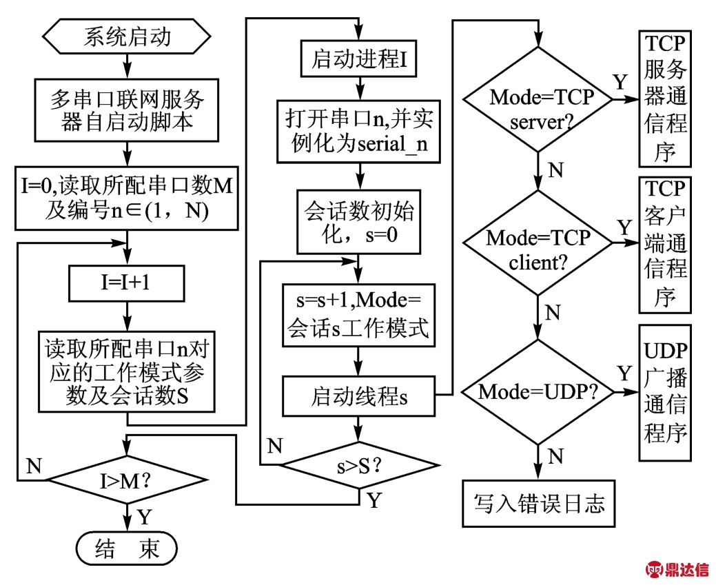 WEB服务器完成配置工作后,即可启动通信程序进行数据通信工作,具体实现流程如图7所示。此程序在设备上电或系统重启后自动启动,读取用户配置的串口通信和工作模式参数后,进入通信程序无限循环,图中进程数即现场应用所配置的串口总数。其中N为串口服务器串口数,M(M≤W)为N个串口中使用的串口数;n为各自编号,I为进程编号;S为所配会话数,s为线程编号。