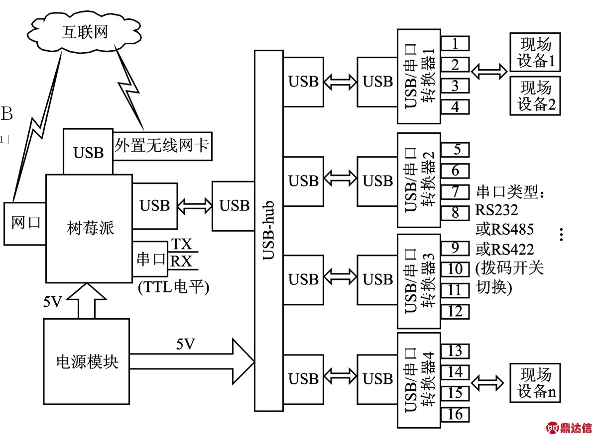 本设计采用的串口服务器的核心设备——树莓派,是一款体积小、价格便宜但功能非常强大的平台,可通过多种通信方式接入互联网,支持多种完整网络协议,结合USB-hub及USB/串口转换器使用,可保证串口服务器使用方便,并实现实时、准确、长时间稳定的数据传输。