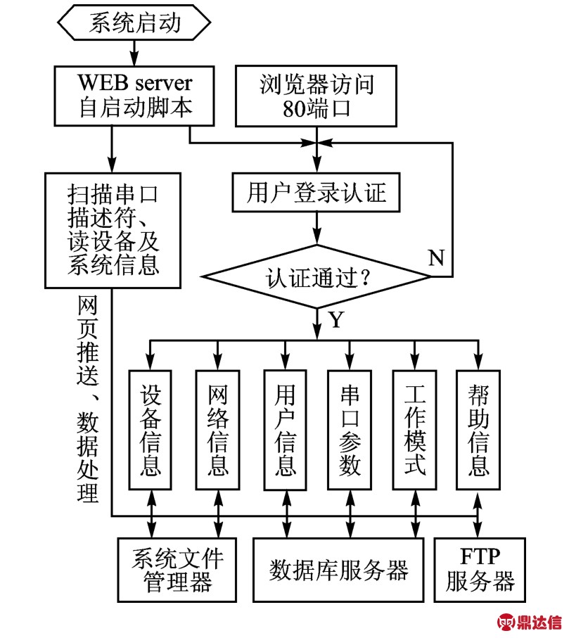设备上电或系统重启后,WEB服务自动启动,并初始化WEB服务器所需显示和配置的信息,用户通过浏览器访问系统指定端口进行登录认证即可访问参数配置页面。其中,设备信息和网络信息通过系统文件管理器进行查看和配置,用户信息、串口参数和工作模式信息通过数据库进行读写,帮助信息则通过FTP服务器进行串口服务器说明手册、公司服务信息等文档下载。