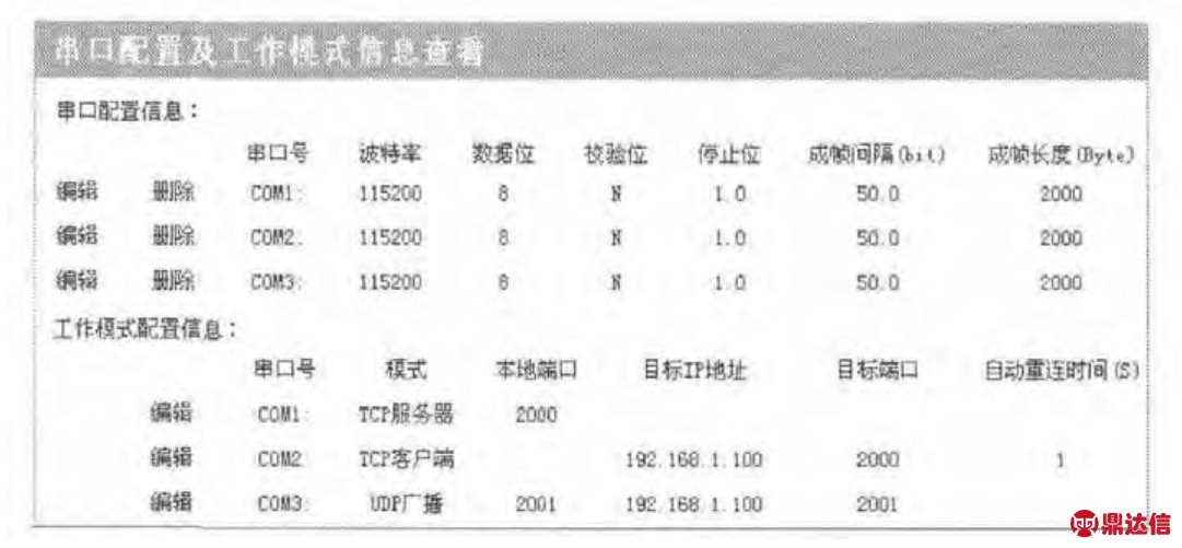 以上配置方式可方便实现批量配置,配置完成后可生成配置信息查看界面,如图6所示,该界面还可进行选中串口的通信参数、工作模式的编辑和删除。
