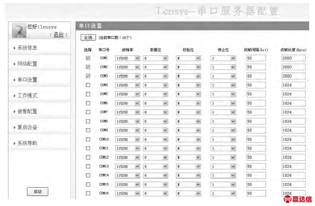 WEB配置页面即WEB服务器的展示层,如图4所示,扫描出的串口数表明该串口服务器带有16个串口,每个串口配置相互独立。