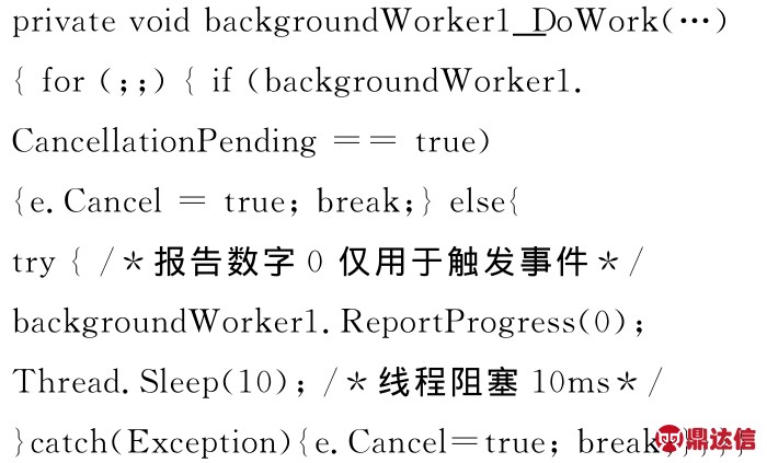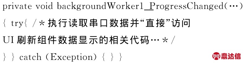 要持续读取串口数据并直接访问UI,辅助线程需不断通过报告进度方法(Report Progress)触发“进度变化”事件.下面的代码中,辅助线程上执行的