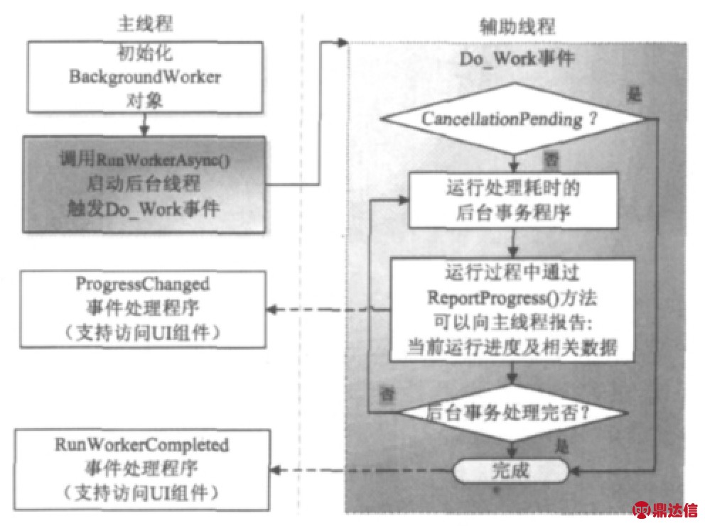 主线程通过Run worker Async引发Backgr ound worker对象在辅助线程上处理Do_Wor k事件以后,在辅助线程中,通过Report Progress方法可以将数据消息封送给主线程中的Progress-Changed事件处理程序;当完成所有事务处理时,也会将消息发给主线程,激发Run Worker completed事件处理程序.辅助线程上引发的Do_Wor k事件处理程序内有两条路径可以实现对主线程中UI组件的安全访问.
