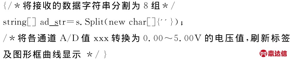 对于所选择的以PIC微控制器为核心的A/D转换模块所发送的8通道A/D值,本文约定通过串口读取的数据为形如“xxx xxx xxx xxx xxx xxx xxx xxx\r\n”的字符串,它以“\r\n”为结束标识.Data Received事件处理程序通过串口读取8通道A/D转换数据时有:String s=serial Port1.Read-Line();调用Read Line时要注意设置串口组件的New Line属性.读取数据字符串s以后,即可同步或异步激发委托实例d访问Set Text.以同步方法Invoke为例,有: