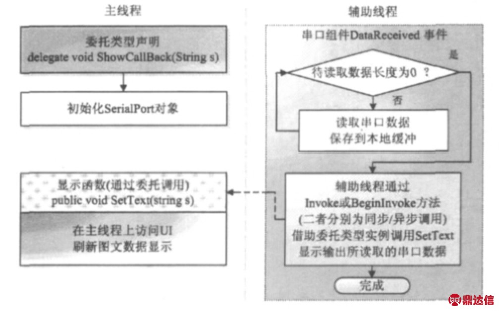 Received,由于其处理程序在辅助线程上引发,故而在事件处理程序中无法直接访问UI组件.为刷新窗体中相关组件的数据显示,根据 MSDN技术手册可知,在Data Recived事件的辅助线程内必须用Invoke激发委托来访问UI组件,它将会在恰当的线程上执行这些操作,实现线程安全调用.