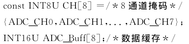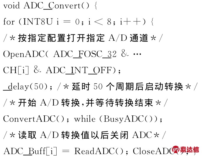 函数ADC_Convert()将对PIC18F452的AN0~AN7通道分别进行 A/D转换.由于 HI-TECH PICC18提供了A/D转换专用库函数,ADC_Convert()的具体实现将大为简化: