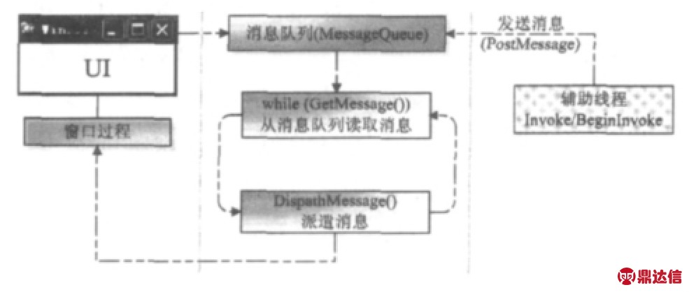 通过Reflector.exe反编译软件可知,在内部实现时,Invoke和BeginInvoke都使用了 Windows API的Post Message函数,其中前者的同步阻塞通过Wait For Wait Handle方法完成.此外,它们还引用通过循环向上回溯查找顶级父控件的Find Marshaling Control方法;使消息进入消息队列的Enqueue方法、定义一个新的视窗消息的API Register Window Message,以便通过 Send Message或Post Message发送(这里仅使用了后者);获取与指定窗口关联的进程和线程标识符的API Get Window Thread ProcessId及获取当前线程唯一线程标识符的Get Current ThreadId.图3描绘二者通过Windows的消息系统实现线程安全的UI访问过程.