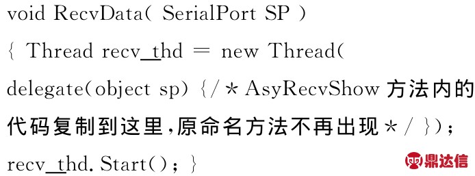 仍使用此前设计的显示委托,下面给出Para meterized Thread Start委托及线程类Thread实现线程安全访问的代码.以串口数据接收与UI访问刷新显示为例,其中Recv Data方法将在form加载时调用,有: