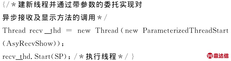 .NET的System.Threading命名空间提供进行多线程编程的类和接口,命名空间中的Thread类可创建并控制线程[6],线程执行的代码通过Thread Start委托或Parameterized Thread Start(带参数的Thread Start)委托指定,使用后者可以向线程过程传递数据.显然,借助Thread类可以不使用串口组件的内置Data Received事件,直接通过线程类与委托实现同样的功能.