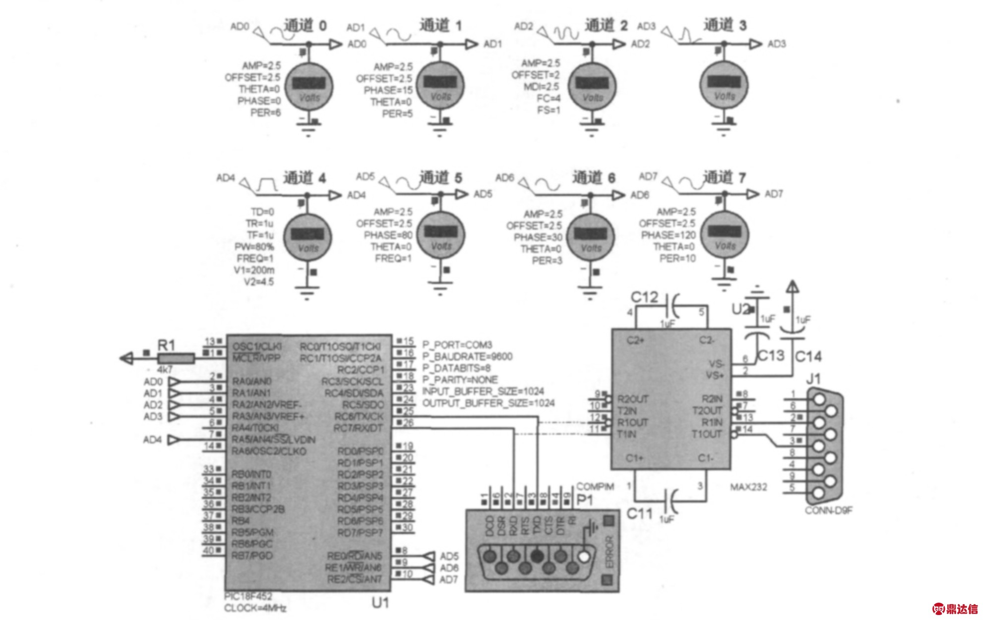 为测试C#程序对串口数据的接收及显示效果,图5给出了所选择的以PIC18F452微控制器为核心的通信测试模块,其中8个10位精度的A/D转换通道(AN0~AN7)分别连接了不同类型的模拟信号,图中同时给出了虚拟仿真串口组件(COMPI M)及物理串口(MAX232)[5-6].