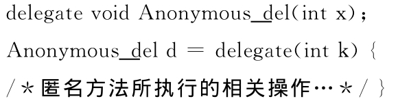 由于“匿名”方法也可以实例化委托,使用匿名方法时无须创建独立的方法,可减少实例化委托所需的系统开销.例如: