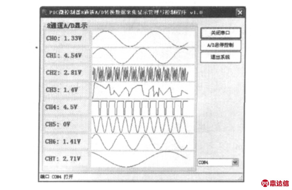 基于HI-TECH PICC18编译器设计的C程序将循环执行8通道A/D转换,并将结果转换为约定的字符串格式,通过串口发送给上位主机程序接收并刷新图文显示.