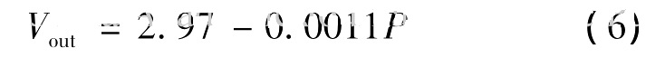 由图10可知,脉搏压力传感器的电容量在压强为0~270mmHg范围内实测值与理论几乎一致,而人体脉搏压是小于270mmHg的。由图11可知,3次测试结果几乎一致,说明脉搏压力传感器的一致性比较好;因此适合于人体脉搏测量。再利用Matlab拟合出了压强P与输出电压V out关系曲线,其线性方程为: