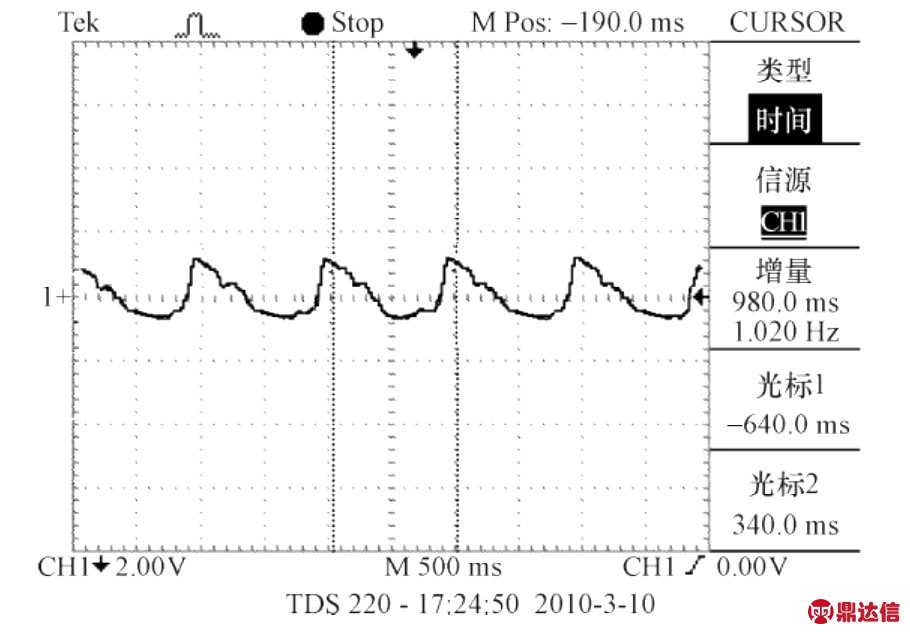 图12是采用泰克TDS220示波器并通过其串口通信扩展模块送至计算机显示得到的一位中年志愿者的脉搏信号波形图。脉搏测试时,被测者心平气和地坐着,将手臂放于桌面上并在下方垫一棉垫,把脉搏传感器对准手腕桡动脉“寸、关、尺”其中一个部位,通过模拟手指把脉运力。