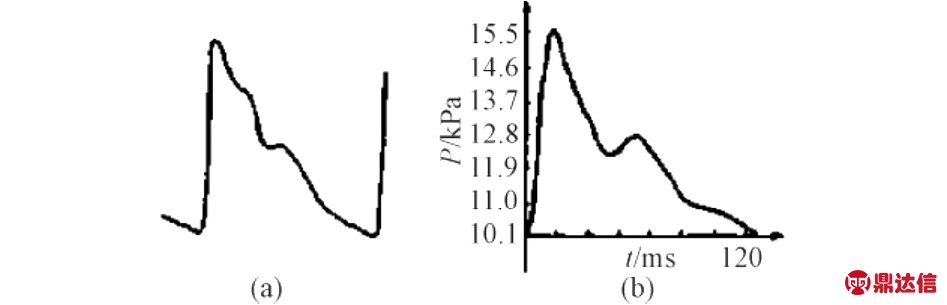 由图12可知,脉搏波周期大约为1s,即心率为60左右,与血压计测出来的心率62基本一致。图13是文献[4]报道的(a)、(b)两例健康人客观化脉象波形,与之对比,本设计所采集到的脉搏波主峰回落时有小的峰[3](回波),所以是客观、正确的。本系统所采集到的脉搏信号波形比较清晰、稳定、一致性好,由此验证了自制压力传感器和信号调理系统的可行性。不仅如此,本系统还可以直接连接到LABVIEW采集卡,将脉搏信号送至上位机进行进一步的信号分析。