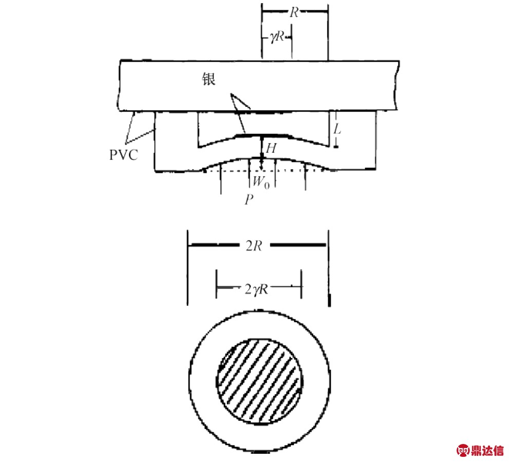本文设计的脉搏压力传感器采用的弹性薄膜材料为PVC,电容极板为金属银浆,电容以空气为介质,这种结构有利于提高传感器的灵敏度和线性度[2],如图1所示。图中黑色加粗的线表示银浆构成的电容极板,γR表示银浆电容极板的半径,R为敏感元的半径,L为电容传感器两极板之间的距离,H代表接触皮肤部分的PVC的厚度,P表示脉搏压力在下极板上形成的压强。