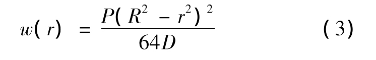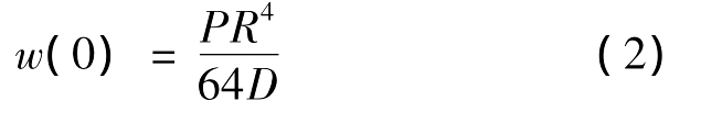 图2是在薄膜表面施加40kPa压强时薄膜的变形分布图,从图中可以看出,传感器敏感元沿半径方向变形是不均匀的,中心位置w(0)的挠度值最大,向两侧递减。