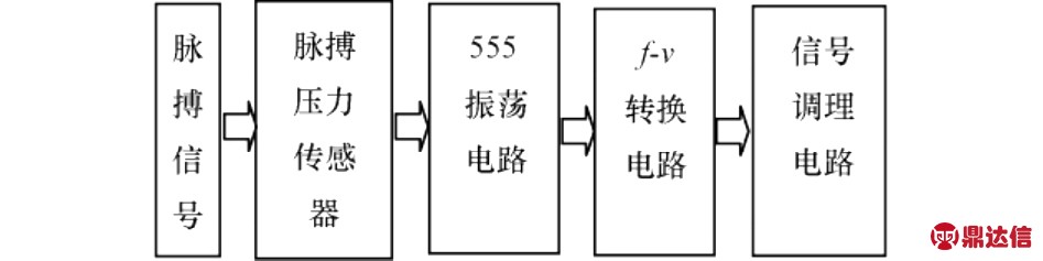 在脉搏压力下,传感器的极距发生变化,导致电容量改变。通过555振荡电路、f-v(LM331)转换电路,将脉搏压力的变化转化为电压的变化量,经过信号调理,最终实现脉搏信号的提取。系统框图如图3所示。