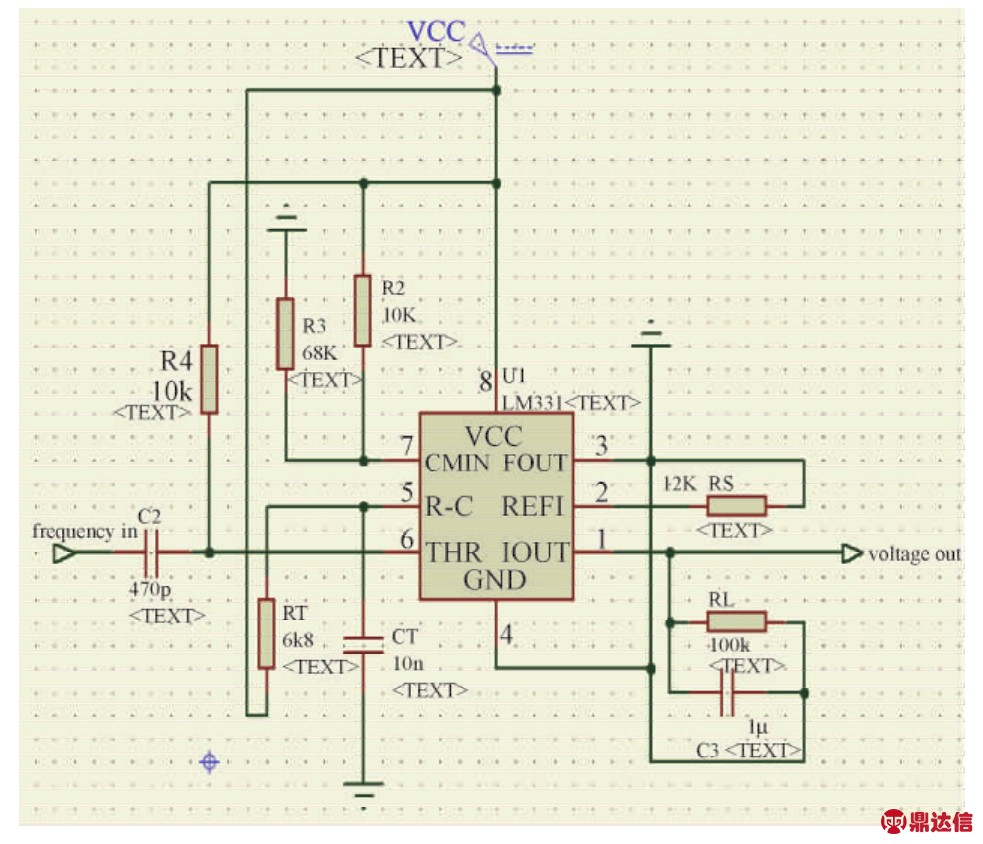 经过555构成的多谐振荡器之后,555电路的输出为频率f in,并作为f-v转换电路的输入量。它随着薄膜压力传感器电容大小的变化而改变,其公式为: