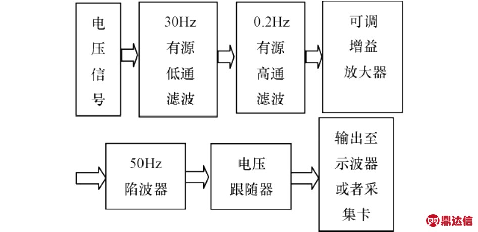 经过滤波后的信号幅度比较小,只有几十毫伏,通过增益连续可调的同相放大器将信号放大到±5V范围内,经过电压跟随器后,可以方便地与采集卡或者示波器相连接。整个信号调理电路结构简单,成本低,但是能高质量地把信号提取出来。