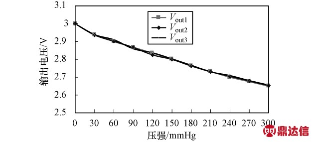 性能测试主要测试脉搏压力传感器的线性度和一致性。测试时,利用血压计气囊充气模拟外加压强施加在脉搏传感器上,施加压强后记录传感器电容量与LM331(f-v)输出电压。测试压强范围0~300mmHg,进行多次重复测试试验。3次重复测试结果如表1所示。