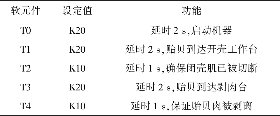控制系统设计主要采用三菱FX2N作为主控单元,通过对电机的延时开关及正转来控制传送带上贻贝的输送。电磁阀控制气压缸活塞杆动作及剥肉真空吸盘的开闭,气压缸霍尔传感器实现对厚壳贻贝开壳刀具及剥肉真空吸盘上下移动的检测,整套控制系统可对贻贝开壳装备进行自动控制[32]。具体工作流程见图12,并根据图12工序进行控制程序I/O分配及编程元件地址分配,如表2、表3所示。