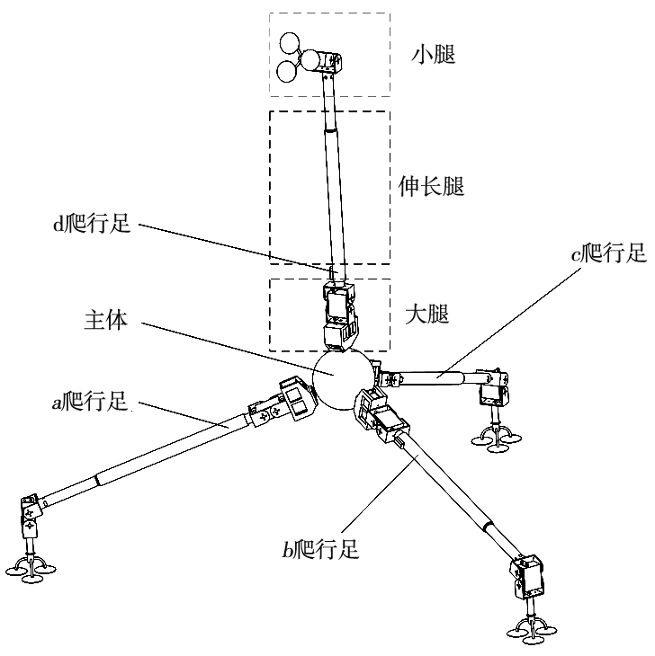 图1为空间四足爬行机器人的总体结构图,机器人主要由主体(中心球壳)、4只爬行足和控制系统三部分组成。在正四面体体心(球壳中心)到4个顶角的连线上对称布置4只爬行足,爬行足安装于机器人的主体(中心球壳),每只爬行足包括大腿、伸长腿和小腿三部分。