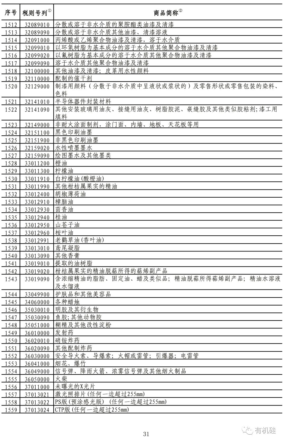 其中,包括硅胶、二氧化硅在内的大量化工产品,主要集中在第四部分。这部分化工产品的加征税率将从5%调整为2.5%。