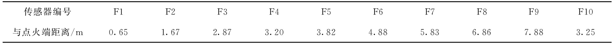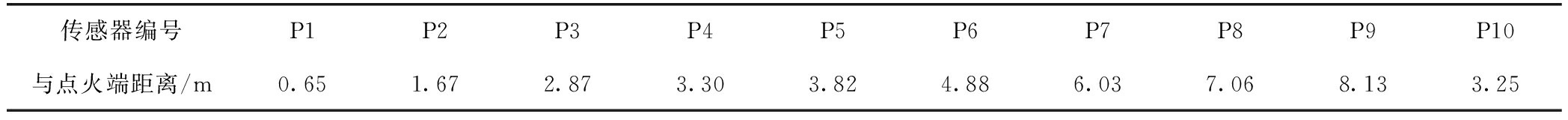为了直观看到瓦斯爆炸效果,在实验Ⅰ型管道上布置了压力传感器和火焰传感器。压力传感器为CYG100型高频压力传感器,量程为0~1.5 MPa,精度小于0.4% FS,响应时间小于1 ms;火焰传感器为CGY100 型火焰传感器,采用光敏三极管作为感应元件,可以准确捕捉火焰信号,信号采集的时间间隔最短可达1 μs。压力传感器和火焰传感器在实验Ⅰ型管道上的布置如表1、表2及图2所示。