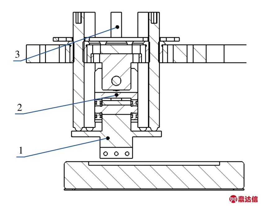 滑块固定与调节单元如图2所示,主要由3部分组成:1)滑块的夹持装置,利用螺钉夹持滑块;2)十字万向节装置,通过该装置滑块可以在一定范围内沿任意角度摆动,以利于倾角的形成;3)微调螺钉,通过8枚螺距为0.25mm的微调螺钉与滑块夹持装置形成类平行并联机构,利用滑块夹持装置的弹性变形可以调整并固定滑块与玻璃盘形成的倾角。实验所用的滑块宽度为0.8,2,4,6mm。采用最小宽度(0.8mm)的滑块,调节过程中干涉条纹变化1/2个条纹(即变化一个明条纹或一个暗条纹),润滑油折射率为1.5,使用波长655nm的红光计算,则倾角调节的分辨率为1/7328,若采用绿光或滑块变宽,则倾角分辨率提高。