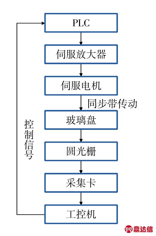 运动控制系统如图3所示,采用“PLC+伺服电机+同步带传动”的传动方案。由于系统的滞后性,实际转速与设定的转速存在一定差异,特别是加减速过程中这一现象更加明显。为获取玻璃盘的实际转速,采用光栅测速,将圆光栅安装在回转体上,保证玻璃盘转速与光栅的同步性。在这里圆光栅采用雷尼绍(RENISHAW)公司的RESR 20,其栅格距为20 μm,采用锥面安装方式。读数头采用配套的RGH20D,其最高分辨率可达5μm。读数头通过研华ADAM-3986接线端子板与研华PCI-1780U数据采集卡相连。读数头RGH20D的设计符合国际EMC标准,具有良好的电磁屏蔽性能。此外为提高读数头可靠性,降低低频信号源伺服放大器和电机编码器的干扰,采用绝缘性好、机械强度高的电木将读数头固定于机架上。