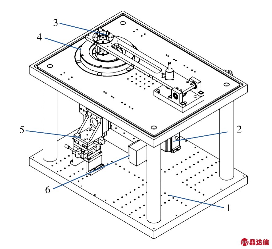 微型滑块轴承油膜厚度光学测量系统整体机械结构如图1所示。整体主要由1机架、2伺服电机、3微型滑块固定与调节装置、4玻璃盘回转机构、5 显微镜调节架、6 3CCD (charge coupled device)和显微镜组成。