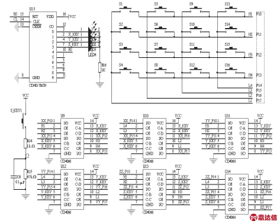 控制电路为从机X,Y,Z所共用,但并不能同时共用,某一时间只能是某一从机占用。通过一个坐标控制切换键选择其中一个从机占用键盘,另外2个则失去控制功能。控制电路的设计主要使用双向开关芯片(bilateral switch)CD4066和十进制计数器/脉冲分配器(decade counter/divider)CD4017构成,具体实现电路如图7所示。