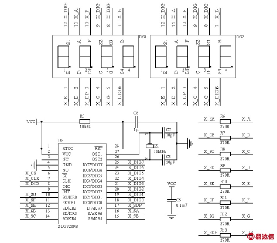 ,CLK,DIO)信号端分别接到单片机的I/O口P20,P21,P22,位选信号端(DIG0~DIG7)接到数码管相应的位选引脚,段选信号端(SA~SG和DP)经过限流电阻后和数码管相应的段选引脚(A~G和DP)相接。驱动芯片的外接晶振为16 MHz,通过一个阻容式上电复位电路接到其复位端。X坐标的显示电路(Y,Z两坐标的与此类似)如图6所示。