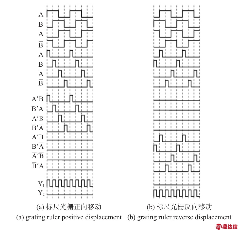 从图3可见,当光栅尺正向移动时,Y1输出原位移信号四倍频后的脉冲,Y2则无脉冲输出;反向移动时,Y2输出原位移信号四倍频后脉冲,Y1则无脉冲输出。由此可见,Y1,Y2就是所求的光栅位移信号经过四倍频和辨向后输出的两路正、反位移脉冲。