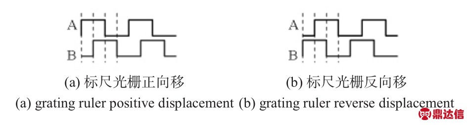 本系统使用的光栅位移传感器为信和公司(SINO)的KA300—470。其正常工作时,将输出两路相差90°,TTL电平的方波信号(标尺光栅正移,A路信号超前B路信号90°;标尺光栅反移,B路信号超前A路信号90°),其波形如图1。