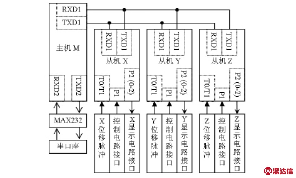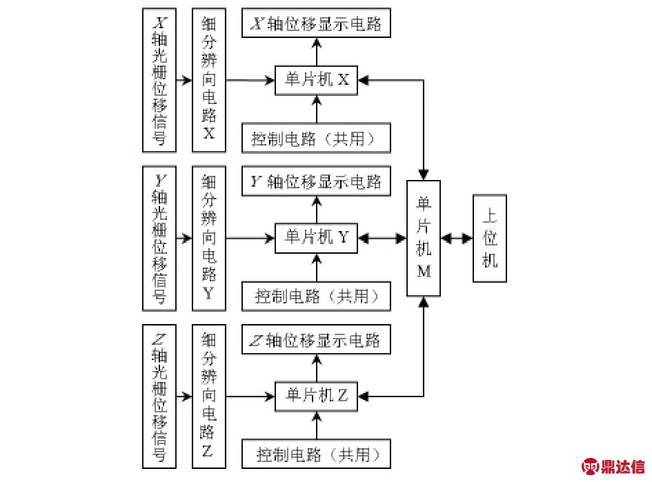 主控电路主要由4片单片机(X,Y,Z,M)组成,它们构成一个多机通信系统,其中,X,Y,Z为从机,M作为主机。从机X,Y,Z处理各轴细分辨向电路输进来的位移脉冲信号,计算位移并把位移送显示电路显示,同时处理控制电路的控制信号。主机M依次和3个从机进行通信,以提取各个坐标轴的位移值,上传到上位机。