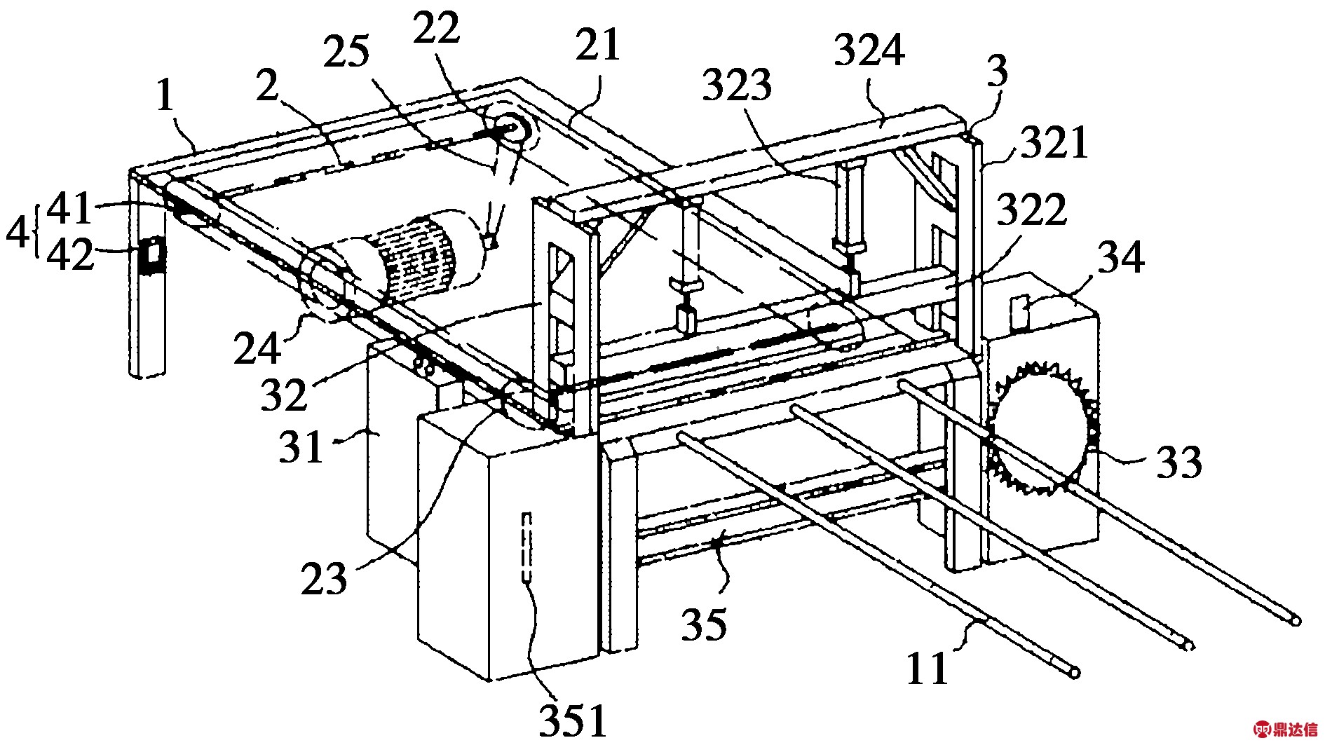 2014年磨志文发明了一种胶合板排板机及其排板的方法[22],如图11所示。该排板机主要包括输送装置2、锯切装置3、测量装置4,锯切装置安装在输送装置的末端,测量装置安装输送带21的驱动辊筒上。由人工将非涂胶单板、双面预胶单板按胶合板结构要求和流水方式铺放到以一定速度运行的输送带上;测量装置的旋转编码器检测输送带驱动辊筒的转动角度,经转换折算成输送带运行的距离,当运行距离达到板坯规格长度时,输送带停止,由锯切装置上的压板322压紧,往复圆锯33对板坯进行锯切;截断后的板坯由支架11支撑。通过旋转编码器对输送带运行距离进行检测并控制板坯的截断长度。该测量装置精度高,控制方便。