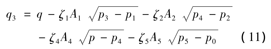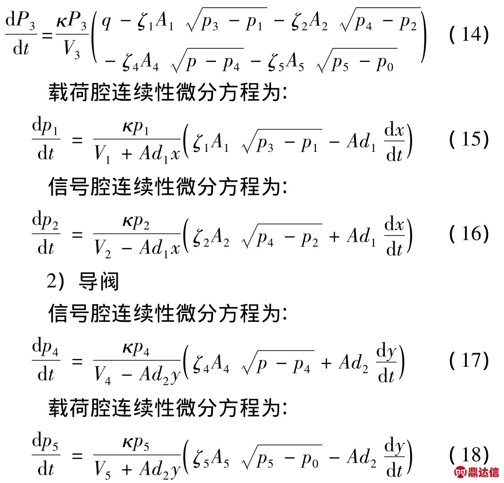式中,A3为低压腔小孔的流通面积;ζ3为低压腔小孔处流量计算系数;A4为导阀信号腔小孔的流通面积;ζ4为导阀载荷腔小孔处流量计算系数;A5为导阀信号腔小孔的流通面积;ζ5为导阀载荷腔小孔处流量计算系数。