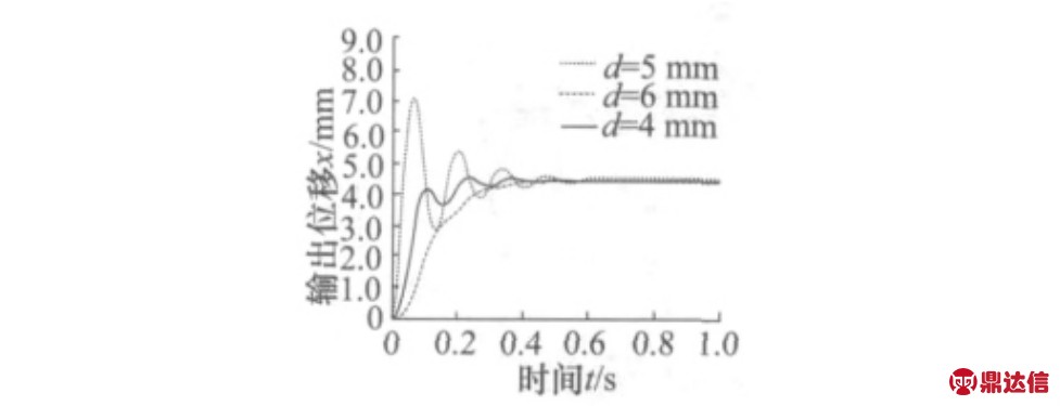 如图4所示,该图反映的是泄流孔直径d与主阀薄膜阀杆连接件位移的响应曲线,其中3条曲线分别代表了泄流孔直径d为4 mm、5 mm、6 mm时薄膜阀杆连接件位移的响应曲线,从图中可以看出当泄流孔直径取5 mm时,既能保持减压阀对与系统压力波动的敏感性,又能保持较小的阀芯位移超调量,使减压阀获得稳定的动态性能。