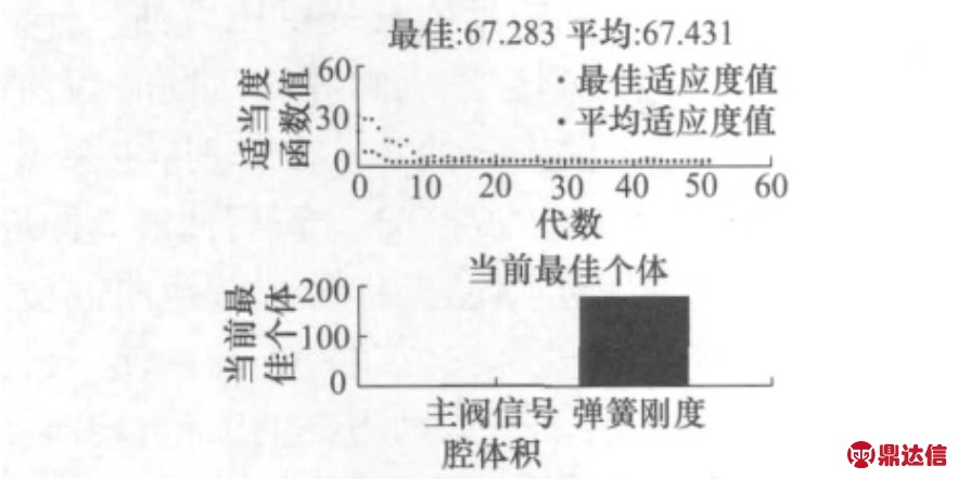在MATLAB工具箱gatool中输入编好的适应度函数名my_fun,以预设的规则对其目标函数进行优化。变量个数设置为2个,分别为弹簧刚度与信号腔体积,在约束栏中输入边界条件[150 0.0002],[250 0.0005]。在图形栏中选择‘Best fitness’和‘Best individual’选项,以便以图形的方式判断目标函数是否收敛,右边的选项栏填入初始值并改变变异因子。遗传算法工具箱中的Population type(种群类型)选择double vector选项,Population size(种群尺度)选择20,其他选项选择default(默认设置),所得结果如图6所示,随着代数的增加,最佳适应度值趋于平稳,到50代时几乎重合,说明找到了最佳个体,满足目标函数的最小值要求。