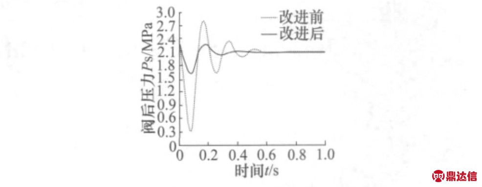 根据遗传优化的结果,将减压阀主阀信号腔体积V 由1.44×10-4m3增大为 1.94 ×10-4m3,将先导阀的弹簧刚度k2由1.67×102N/mm提高为1.79×102 N/mm。改进的参数带入Simulink模型当中得到优化后的减压阀动态特性曲线。由图7可以看出,在入口压力4 MPa的工况下,先导式减压阀内部结构参数经过优化后,阀后输出压力最大超调量由之前的1.7 MPa减小为0.5 MPa,系统动态响应时间从0.65 s缩短为0.42 s,减压阀的动态特性得到了优化。