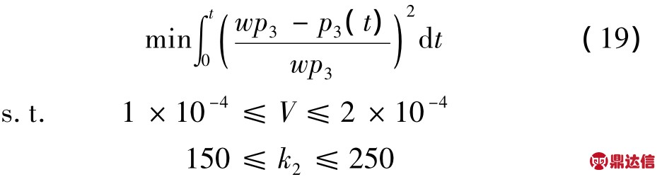 函数优化问题是遗传算法的经典应用领域,也是对遗传算法进行性能评价的常用算例[8-9]。以阀后输出压力p3为目标函数,wp3为阀后压力稳态值,这里选择弹簧刚度与主阀信号腔体积为优化对象,并为其选择一个适度的优化范围,建立天然气高压先导轴流式减压阀的优化数学模型为: